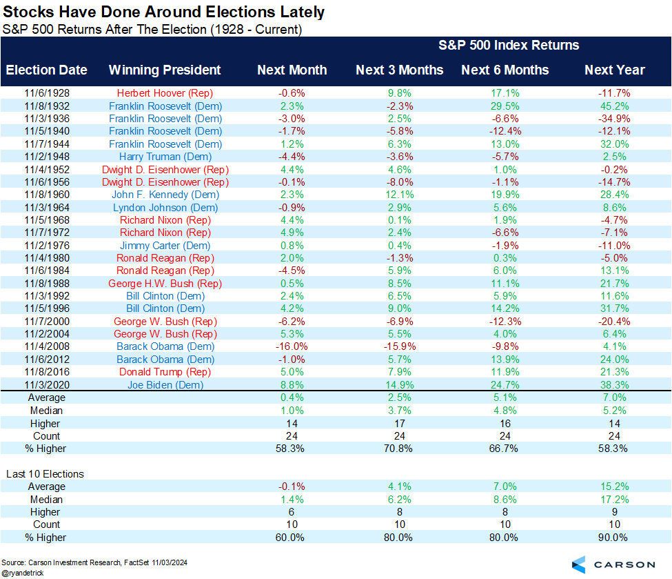 And here's how stocks have done following the last 24 elections. What really stands out is how well stocks have done after the last 10 elections. Higher 80% of the time 3 and 6 months later, and higher 90% of the time 1 year later with an average return of 15.2%